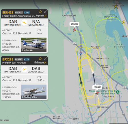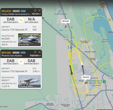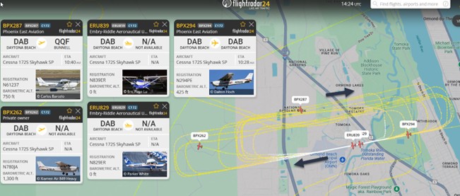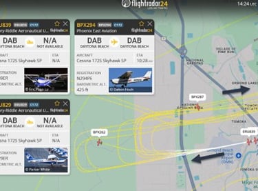 If you use the flightradar24.com or ADSB-Gen app you will be able to see active flights and the direction the aircraft are flying. You will also be able to identify the aircraft, altitude and speed and if you click on it, the past path for that flight they signed on to their transponder. If it is real quiet in Tomoka Estates, I take a look and sometimes see they are using the north/south pattern. Or if I hear what sounds like a airplane gliding and motor barely running, they are using the west to east pattern. Or if it’s raining and I don’t see any aircraft I take a look on the app above at Daytona Beach Airport to see if any aircraft transponders are on. Usually not, they don’t train in rainstorms, they wait till they get their pilots license and learn while they fly.