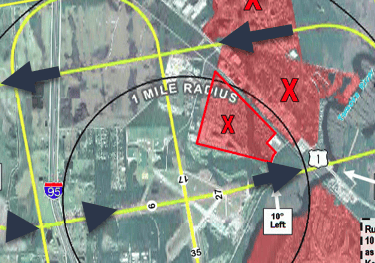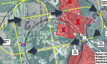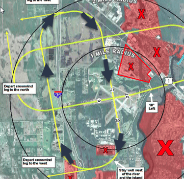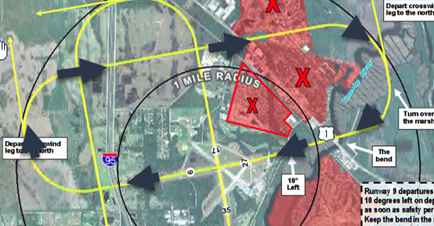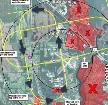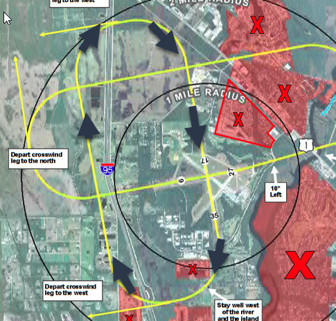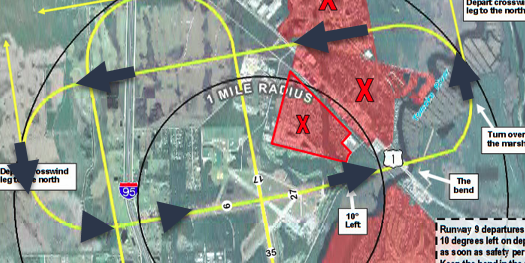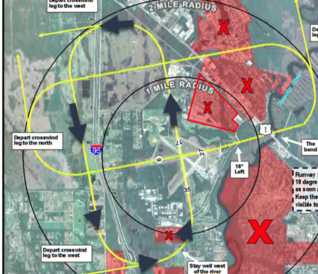 Runway 27, runs east and west. Depending on the wind the aircraft prefer to take off from the west to the east, crossing over US 1 and turning to the left north and then turn again to go west for the return to the airport. They usually go past I-95 and come in on Runway 9. And then take off again on runway 27. This is how most of the noise abatement complaints come from when the turn is made early or after turning come back over the homes in Tomoka Estates. (black arrows below show the direction aircraft are moving and the RED X is residential areas the City of O.B. requests pilots to avoid in their “voluntary” noise abatement program)